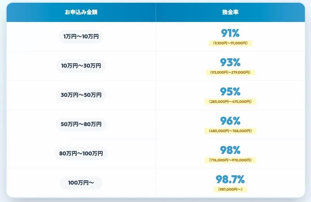 まとまった金額を利用するほど換金率はアップし、よりお得に