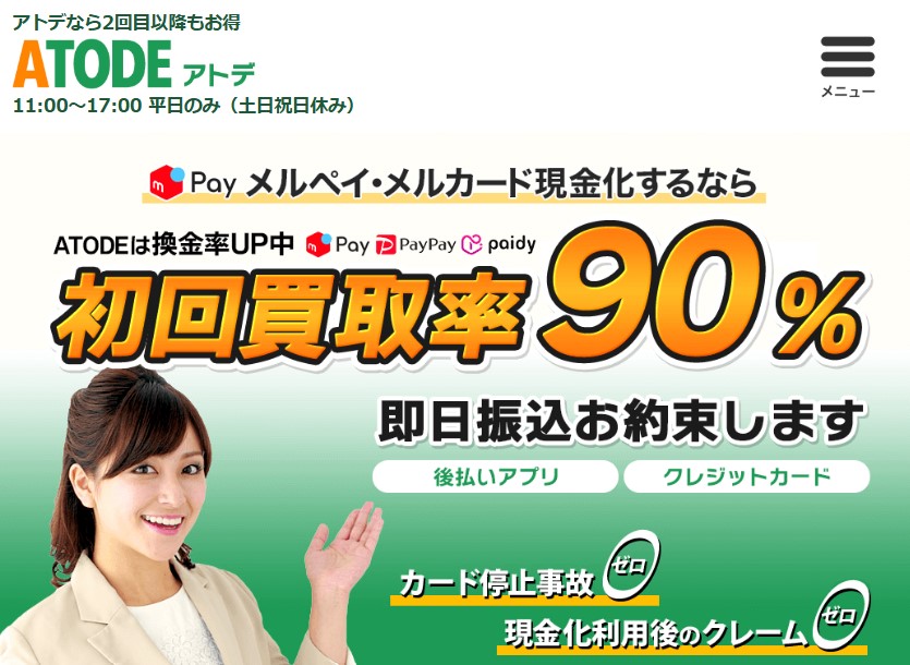公式ページに記載されている換金率より多くメルペイ10万円利用で88%の換金率で利用できました。最大98%とかありえない換金率を記載している業者より、ミニマム値を掲載してるので他の業者よりも分かりやすいと思います。