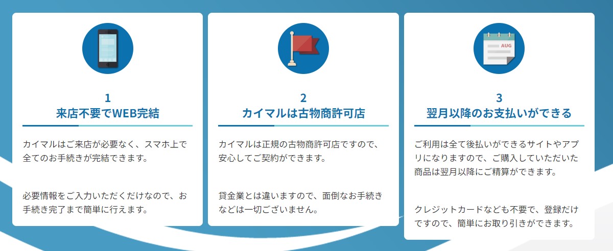 カイマルは法律を遵守して後払いを徹底することで安全に現金化ができる仕組みです。